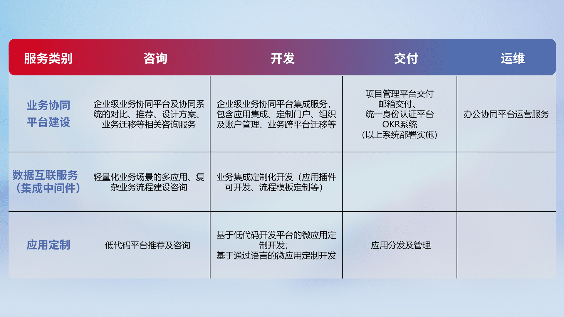 针对钉钉、、、、企微、、、、IDaas等平台级产品提供产品的规划、、、方案、、、交付、、、、定制化开发等服务,,,实现如统一协同办公、、智能客户服务、、混合会议管理、、智能数据查询、、、等业务场景,,,,实现数字化转型。。。